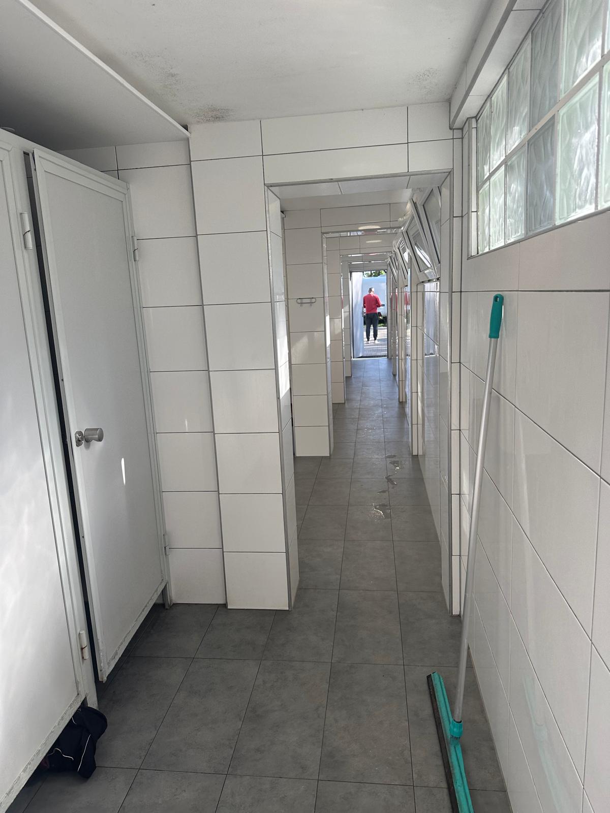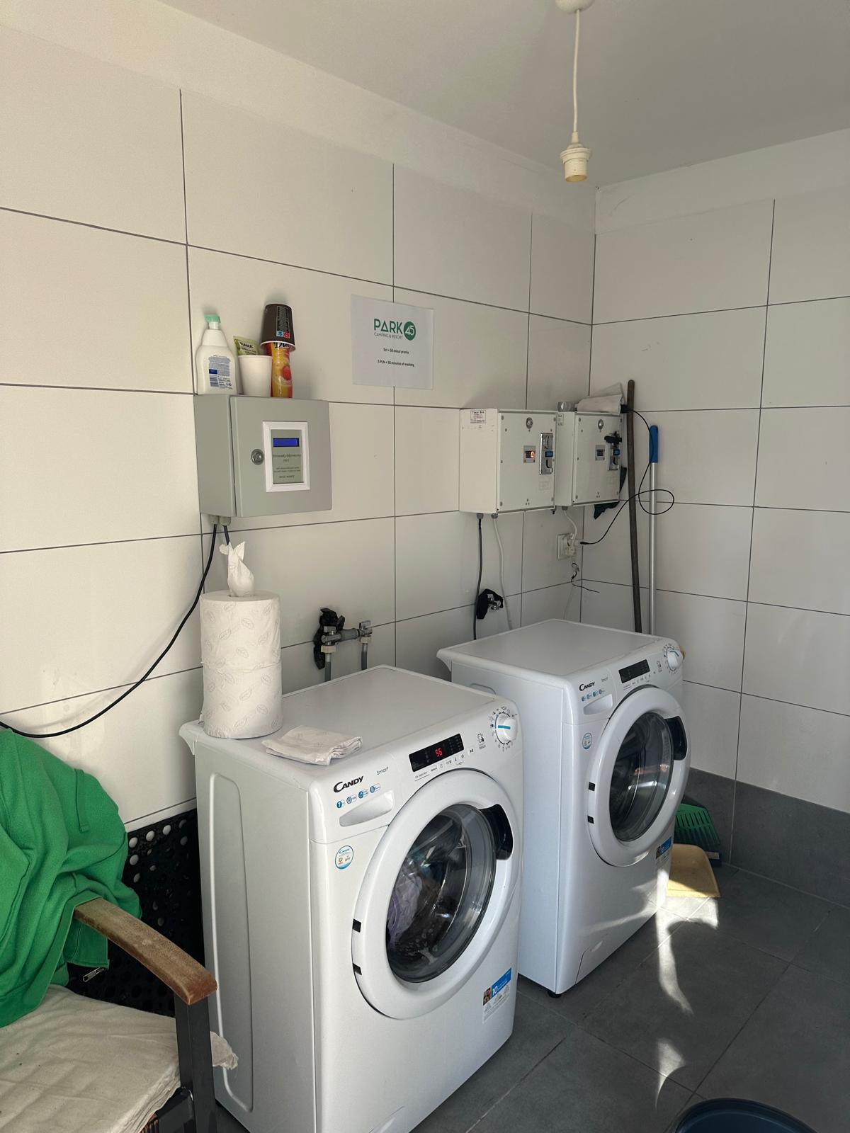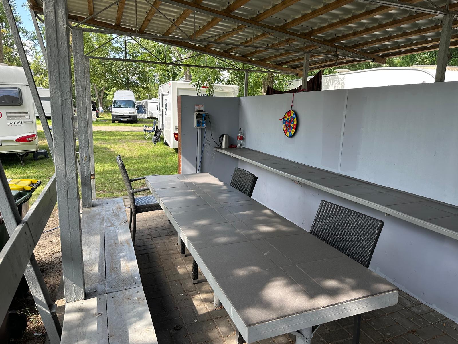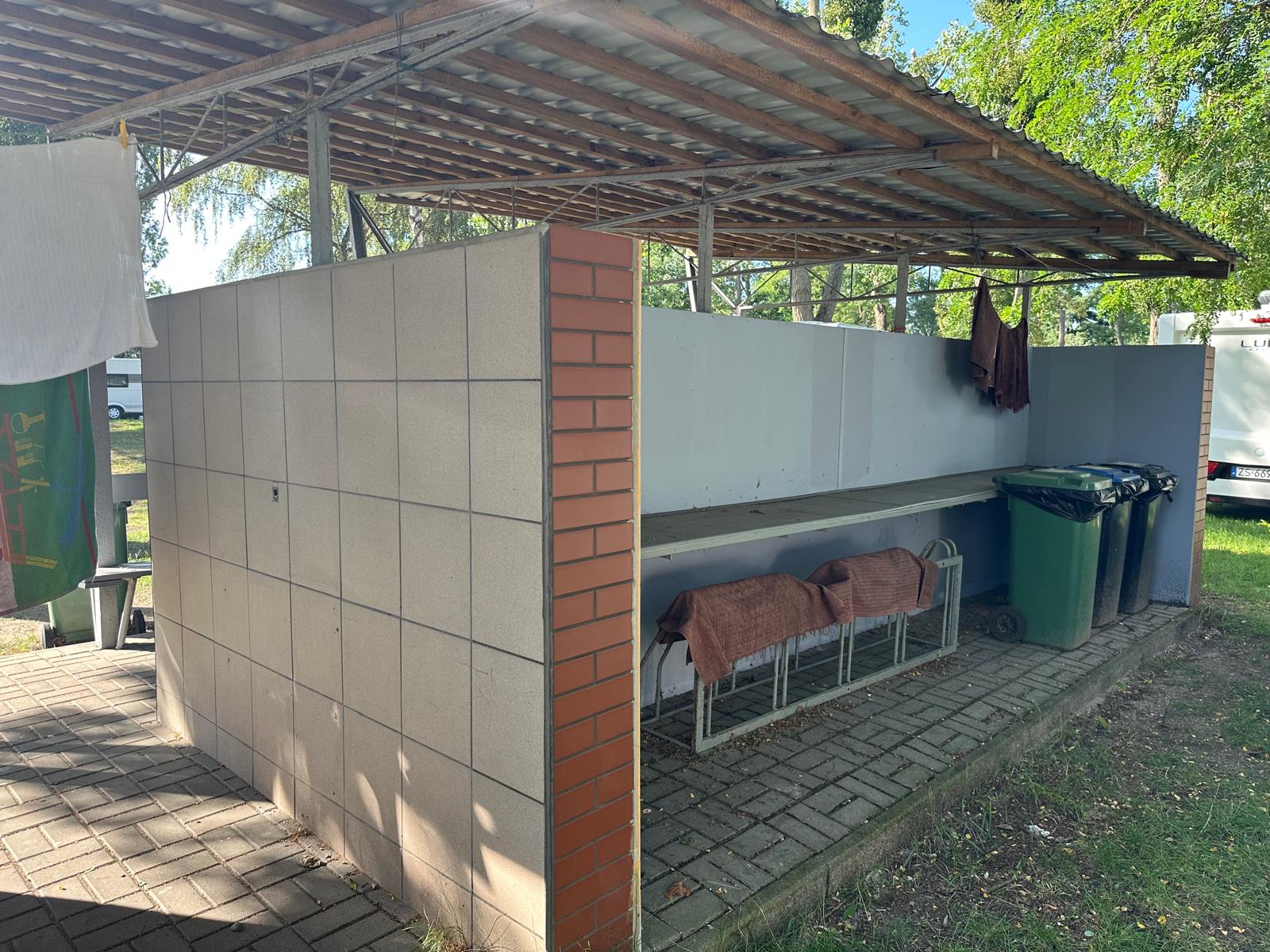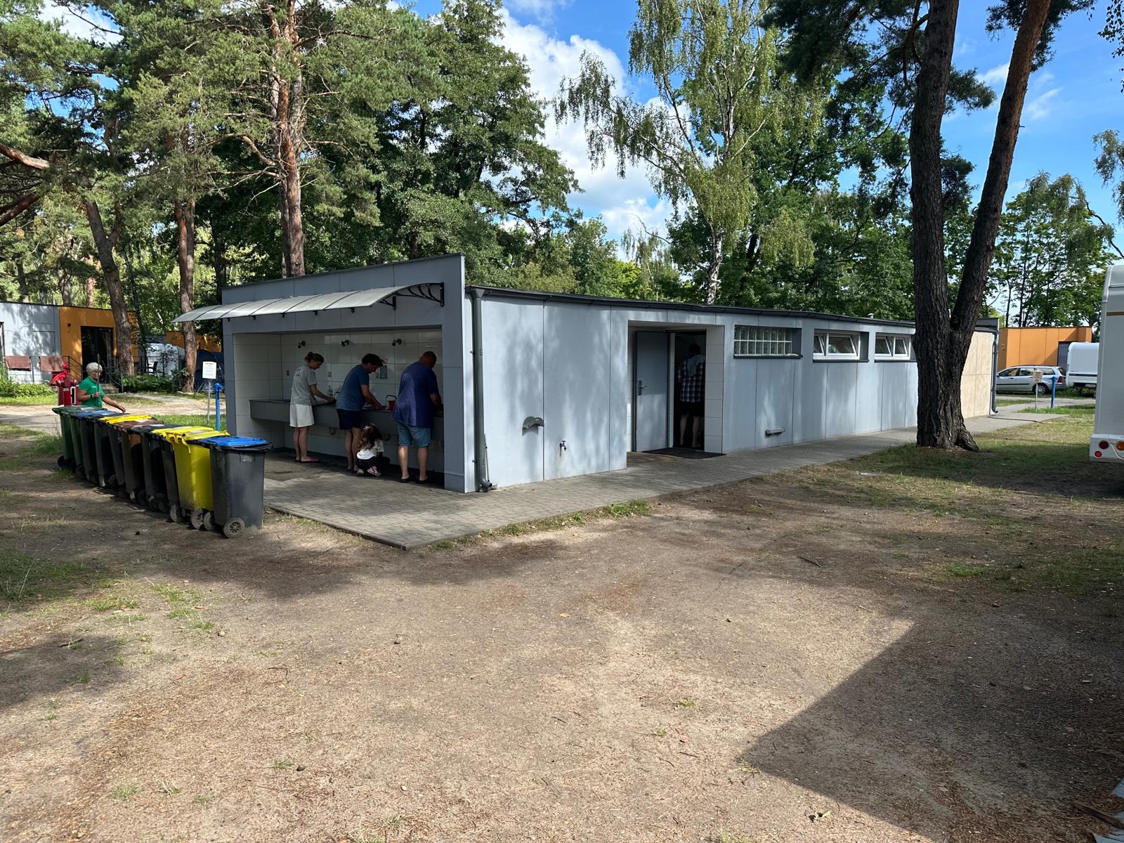 Jako kemping miejsce to ma odhaczone sanitariaty, czy kuchnie polową, ale w stylu “minimalnie, byle było”. Łazienki nie są stare i brzydkie, ale są małe, ciasne i pełne kolejek. To taki w miarę nowy długi barak. Kabiny zaraz przy wejściu, jedna przy drugiej, oddzielone, co prawda niezbyt starą ścianką, ale jednak woda pod nogami przelewa się z jednej kabiny do drugiej (. Wieczorem ciężko znaleźć miejsce przy umywalce. Boczna ściana budynku sanitariatów stanowi miejsce do mycia naczyń. Tu przy zlewach stoją kosze na śmieci i punkt zrzutu odpadów. Wszystko tak na kupie.