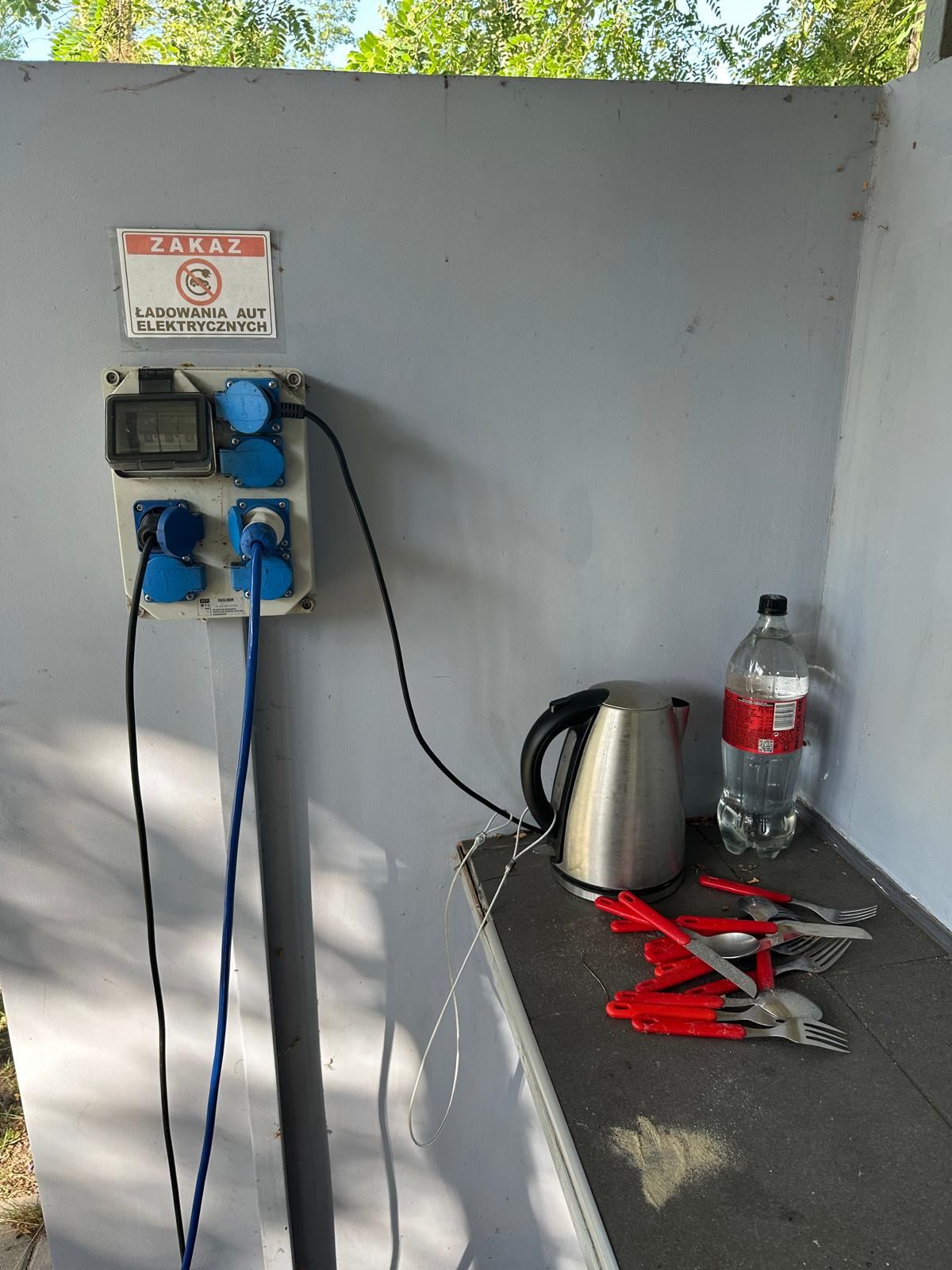 Kuchnie kempingową stanowi blat pod dachem. Na blacie czajnik i woda w butelce po coli oraz rozrzucone widelce. Brak wody bieżącej, brak kuchenki. Tuż przy kuchni (na drugiej ścianie) rozwieszane są szmatki, którymi sprzątano obiekt.