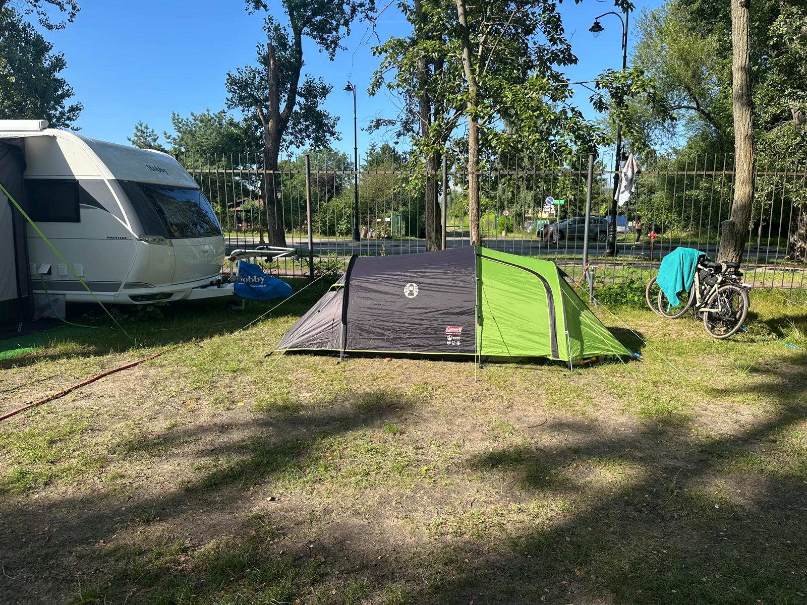 Ostatnie zdjęcie to nasz namiot i rowery. Rozbiliśmy się przy samym płocie. Podczas naszej jednej doby na tym kempingu w środku wakacji było tam bardzo dużo osób i mało miejsca na namiot. Przyczepy stały tam kilka metrów od kuchni polowej lub od apartamentów.