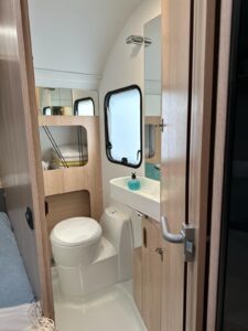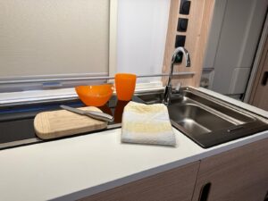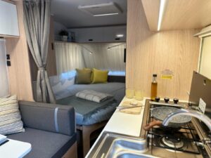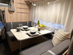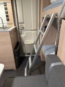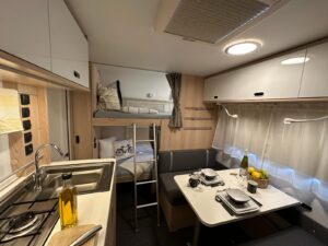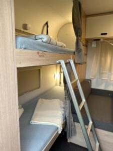 - Ilość miejsc do spania: 5,5. Wymiary łóżek piętrowych to 67×185, ich maks. obciążenie to 70 kg. Wymiar łóżka podwójnego to 140×200. Wymiar łóżka powstałego po złożeniu stołu to 98×182 (dwoje dorosłych miałoby ciasno, odpowiednie według nas dla jednej osoby lub dwójki mniejszych dzieci)