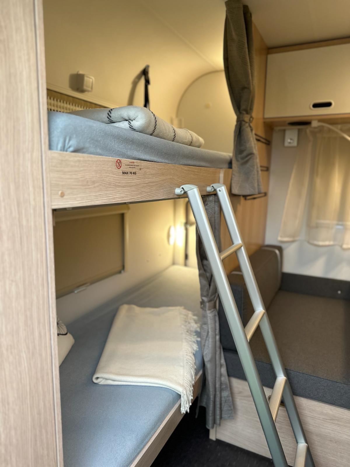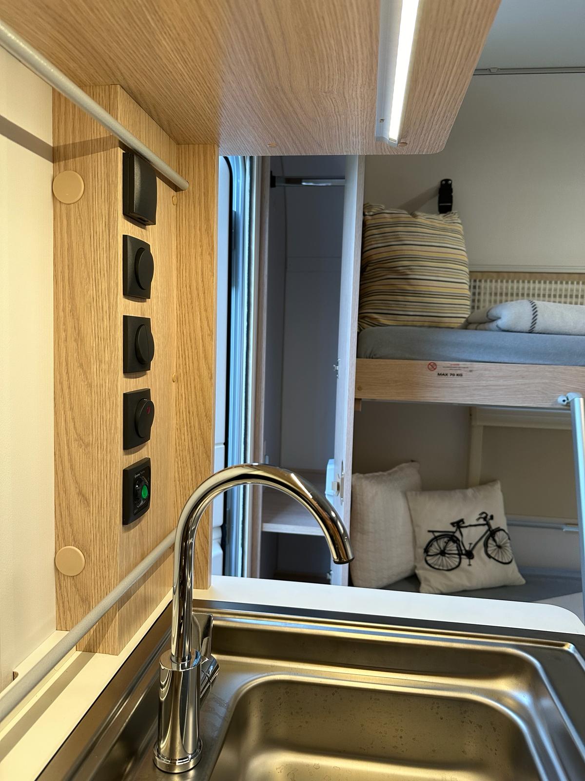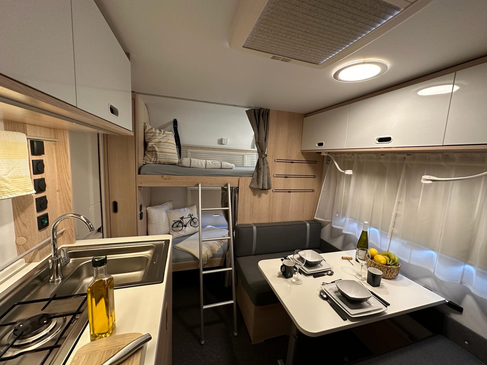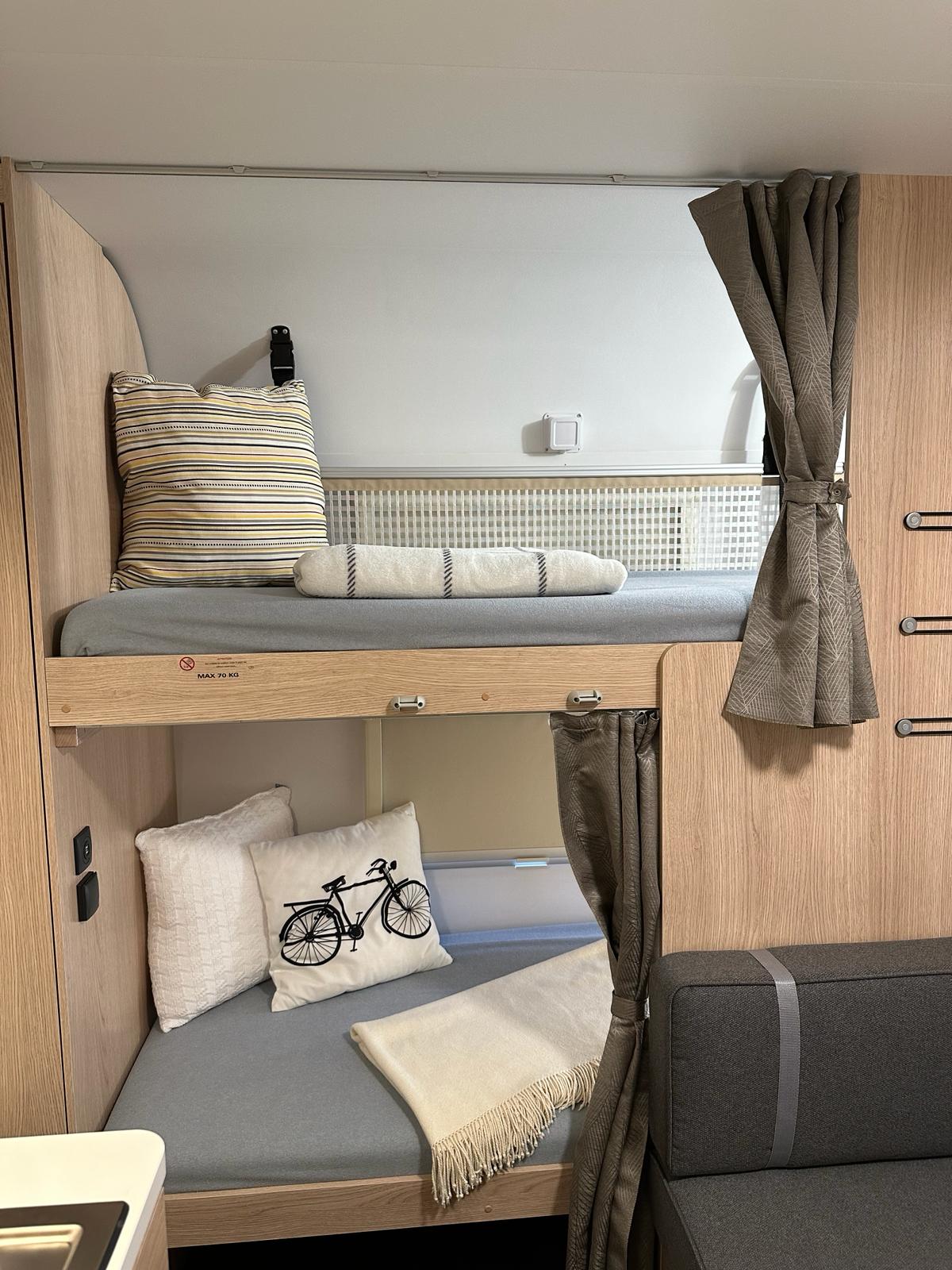 • Ilość miejsc do spania: 5,5. Wymiary łóżek piętrowych to 67×185, ich maks. obciążenie to 70 kg. Wymiar łóżka podwójnego to 140×200. Wymiar łóżka powstałego po złożeniu stołu to 98×182 (dwoje dorosłych miałoby ciasno, odpowiednie według nas dla jednej osoby lub dwójki mniejszych dzieci)
