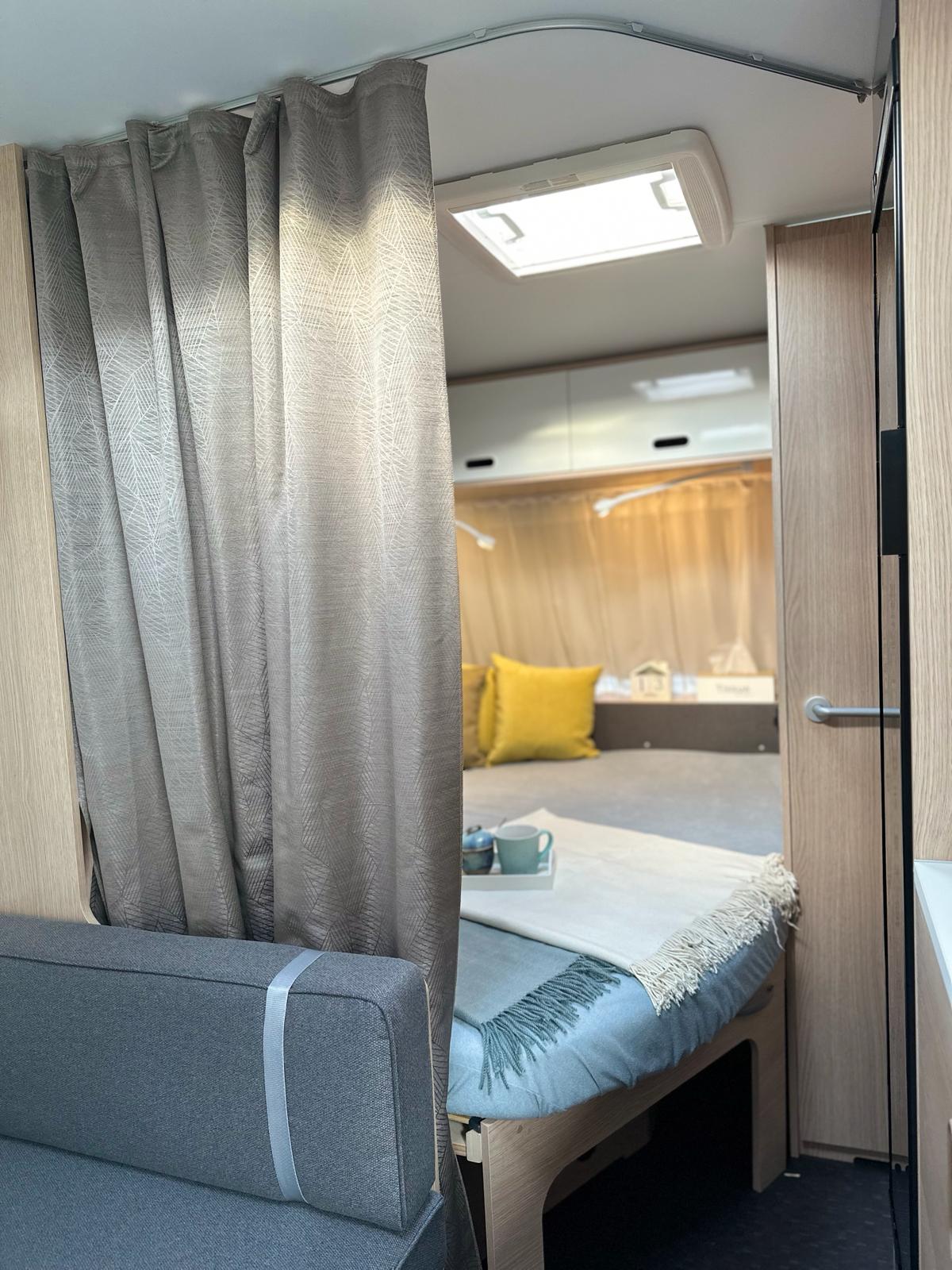 • Trzy wewnętrzne zasłony oddzielające łóżka piętrowe i łóżko małżeńskie od salonu